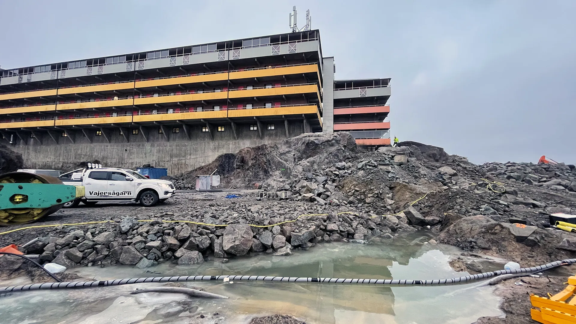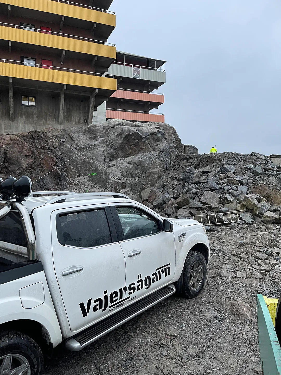 Solna, StockholmVajersågning längs en fasad för att minska vibrationer och få en rak bergsvägg efter sprängning.